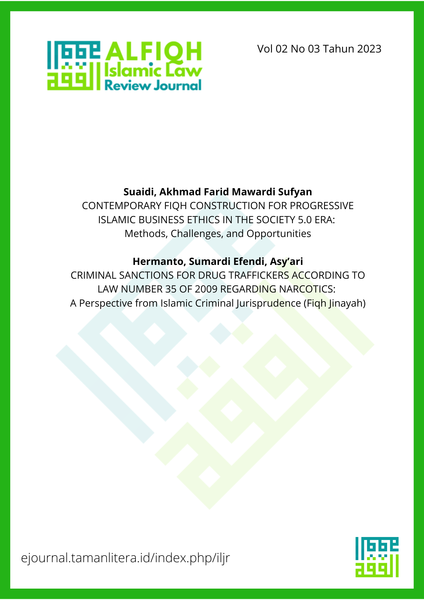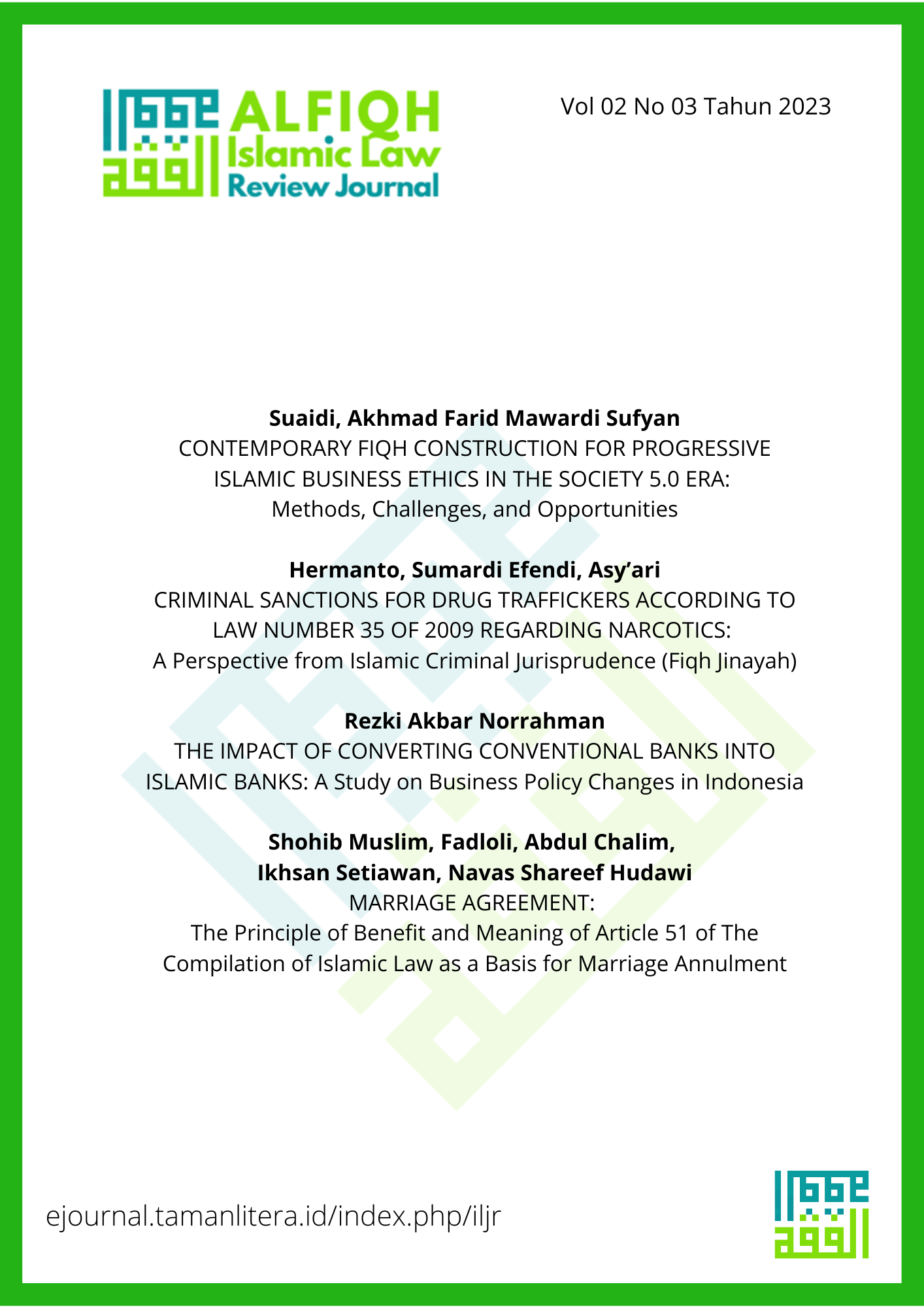 The ALFIQH Islamic Law Review Journal's Volume 2, Issue 3, presents diverse perspectives from scholars in Indonesia, India, and Malaysia. "Contemporary Fiqh Construction for Progressive Islamic Business Ethics" explores opportunities in the Society 5.0 era. "Criminal Sanctions for Drug Traffickers" discusses Islamic criminal jurisprudence. "The Impact of Converting Conventional Banks into Islamic Banks" analyzes policy changes in Indonesia. "Marriage Agreement" delves into the principle of benefit. Lastly, "Reinterpretation of Maqashid al-Sharia in Indonesian Legal Products" offers fresh insights.
