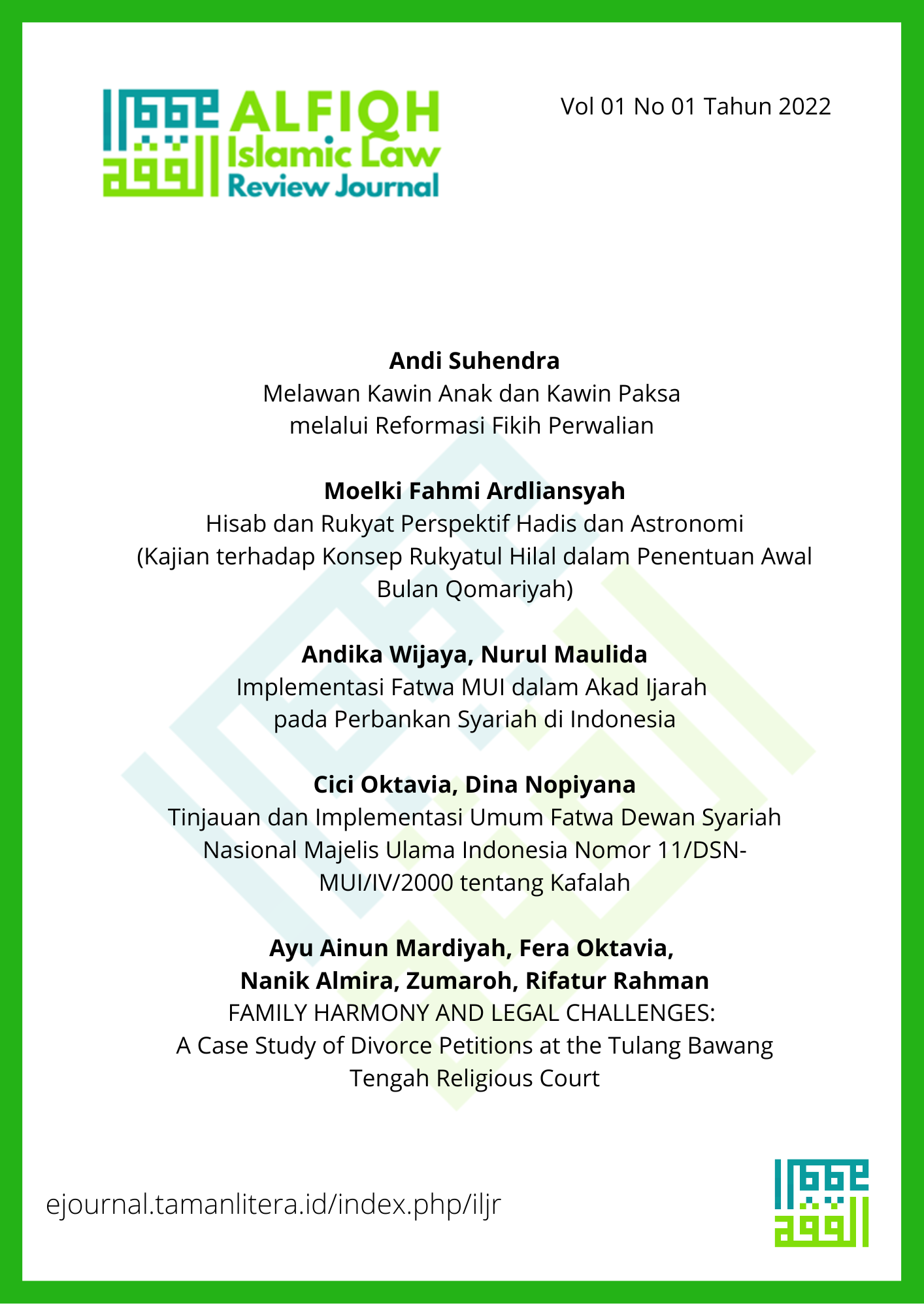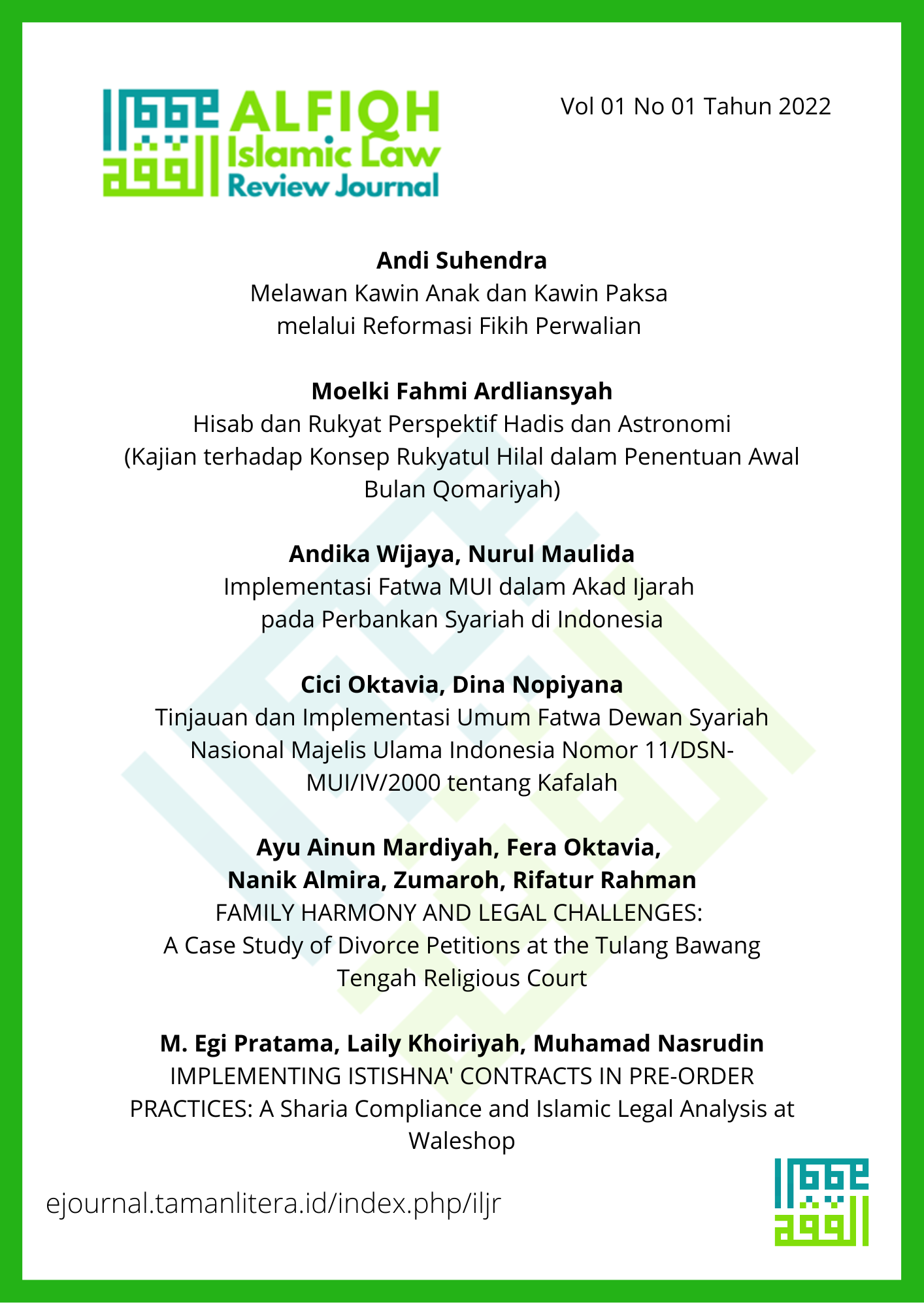 The inaugural issue of ALFIQH Islamic Law Review Journal Volume 1, Issue 1 (2022) features studies on various Islamic law topics. It covers "Rukyat and Hisab: Hadith and Astronomy Perspectives" for lunar month determination, evaluates "Implementation of MUI Fatwa in Ijarah Contracts" in Islamic banking, and reviews "DSN MUI Fatwa No. 11/DSN-MUI/IV/2000 on Kafalah." It also examines "Family Harmony and Legal Challenges" in divorce cases and "Implementing Istishna' Contracts in Pre-Order Practices" for Sharia compliance.