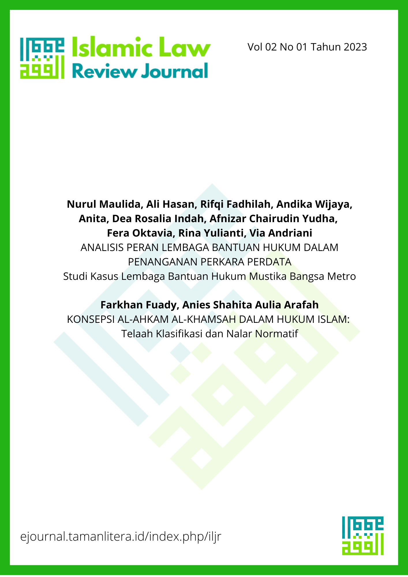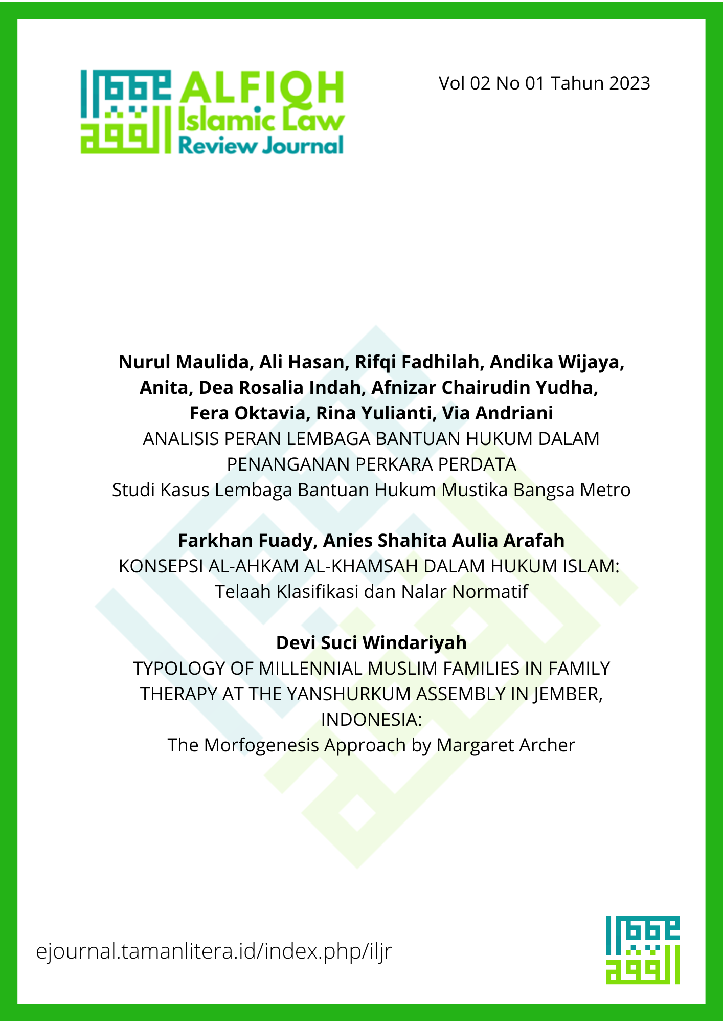 ALFIQH Islamic Law Review Journal's Volume 2, Issue 1, features Indonesian and Indian scholars exploring diverse legal aspects. "The Role of Legal Aid" delves into Islamic civil cases. "The Concept of Al-Ahkam Al-Khamsah" examines classification and normative reasoning. "Millennial Muslim Families in Family Therapy" employs the morphogenesis approach. "The Concept of Ta'aruf and Its Impact After Marriage" studies post-marriage effects. Lastly, "Islamic Inheritance Law" comprehensively analyzes principles and successor heirs in inheritance division in Indonesia, offering a fresh perspective on legal issues.